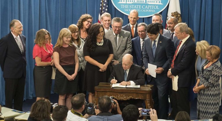 加州州長布朗簽署參議院100號法案(SB 100)。圖片來源:Office of the Governor