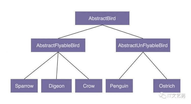 可能又會說,那我們再通過 AbstractBird 類派生出兩個更加細分的抽象類:會飛的鳥類 AbstractFlyableBird 和不會飛的鳥類 AbstractUnFlyableBird,讓麻雀、烏鴉這些會飛的鳥都繼承 AbstractFlyableBird,讓鴕鳥、企鵝這些不會飛的鳥,都繼承 AbstractUnFlyableBird 類,不就可以了嗎?具體的繼承關係如下圖所示: