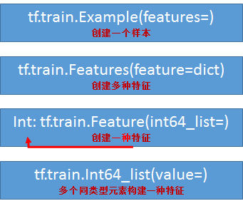 ut = tf.train.Features(feature={ "suibian": tf.train.Feature(int64_list=tf.train.Int64List(value=[1, 2, 4])), "a": tf.train.Feature(float_list=tf.train.FloatList(value=[5., 7.])) }) print(out) # feature { # key: "a" # value { # float_list { # value: 5.0 # value: 7.0 # } # } # } # feature { # key: "suibian" # value { # int64_list { # value: 1 # value: 2 # value: 4 # } # } # }