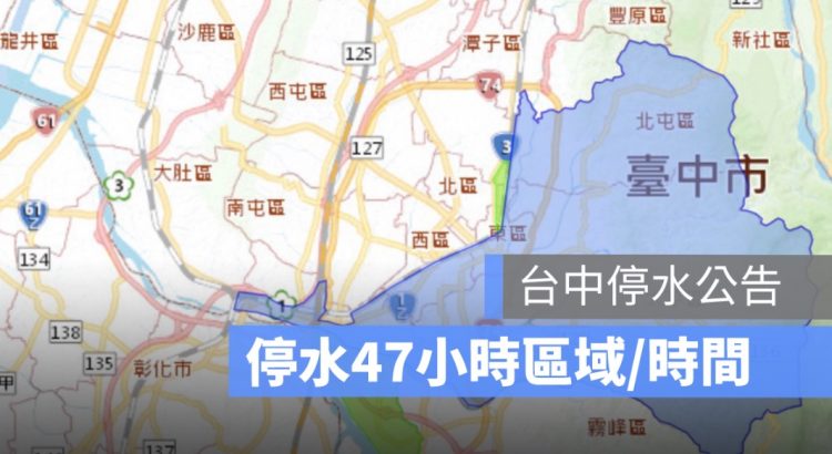 自來水公司停水公告內容:臺中市聚興配水池新舊管連接、臺中鐵路高架 化騰空廊道下埋設管線及鯉魚潭場第二送水管工程銜接」等3案工程, 7 個行政區部分區域將會停水。