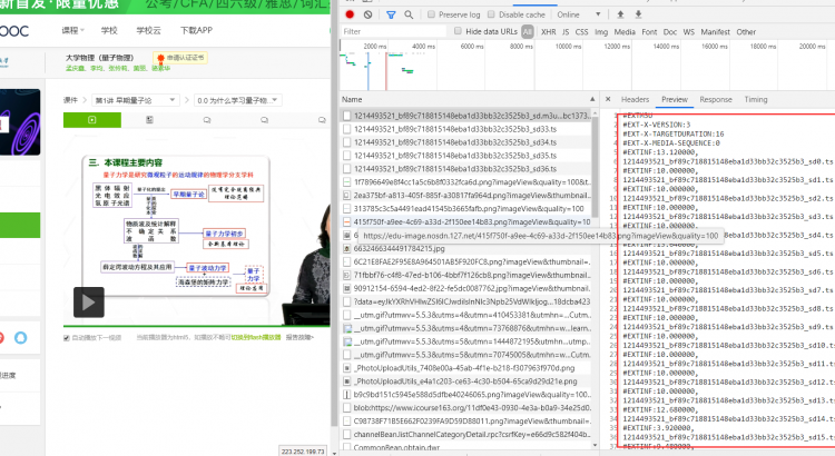 隨便打開一門課程,就可以發現在網絡請求中存在一個m3u8的文件,在preview中預覽,它並不像我們想象中是亂碼的視頻流。