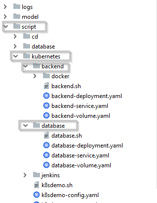 “kubernetes”目錄下有兩個子目錄“backend”和“database”分別存放後端程序和數據庫的配置文件。它們內部的結構是類似的,都有三個“yaml”文件: