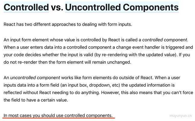 對非受控組件與受控組件作了如圖中下劃線的邊界定義。一經推敲, 該定義是缺乏了些完整性嚴謹性的, 比如針對非表單組件(彈框、輪播圖)如何劃分受控與非受控的邊界? 又比如非受控組件是否真的如文案上所說的數據的展示與變更都由 dom 自身接管呢?