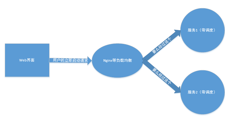 圖還是原來的圖,但是這時候情況不一樣了,因為停止任務的時候假如當前正在執行這個任務的節點處於服務1,負載均衡是不知道要去把你引到服務1的,他可能會引入到服務2,那就悲劇了,所以通用的做法就是停止請求過來不管落到哪個節點上,那個節點就往一個公用的mq上發一個帶有停止任務業務含義的消息,各個節點訂閱這個消息,然後判斷都判斷任務在不在自己這裏執行,如果在就執行停止操作。但是這樣勢必讓我們的調度服務又要依賴一個外部的消息隊列服務,就算很方便的就可以引入一個外部的消息隊列,但是你真的可以駕馭的了嗎,消息丟了咋辦,重複發送了咋辦,消息服務掛了咋辦,網絡斷了咋辦,又引入了一大堆問題,那我是不是又要寫n篇文章來分別解決這些問題。往往現實卻是就是這麼殘酷,你解決了一個問題,引入了更多的問題,這就是為什麼bug永遠改不完的道理了。當然這不是我的風格,我的風格是利用有限的資源做盡可能多的事情(可能是由於我工作的企業都是那種資源貧瘠的,養成了我這種習慣,土豪公司的程序員請繞道,哈哈)。