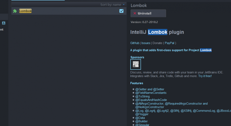 不過IDEA似乎無法識別,代碼檢查還是會報錯,所以,使用IDEA的時候還得安裝一個插件,在plugin搜索lombok,之後安裝重啟即可,如圖