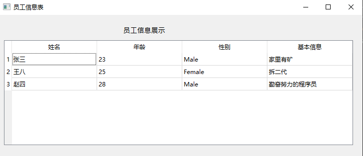 上述基本例子實現了員工信息表格展示的初始化,單元格內容手工添加其實在實現場景不合適,只是方便展示,下面講解如何通過代碼實現方式添加單元格內容以及實現單元格內容顏色、字體變化的實現。說明,下述所有代碼添加都在主程序中完成。目的是使程序實現更靈活,方便維護。