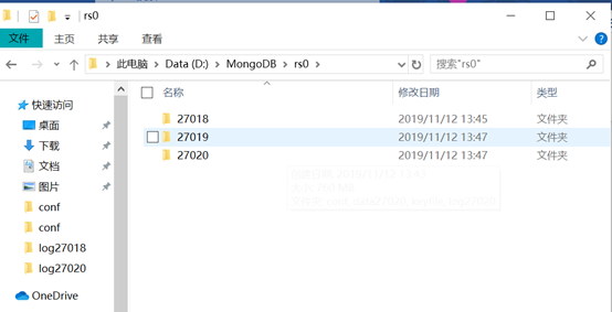 每一份的目錄結構如下,conf存放的是配置文件信息,data27018是存放數據庫數據信息,keyfile是存放key文件的。用於各個節點之間的身份驗證。log存放數據庫的日誌信息,用來排查問題。