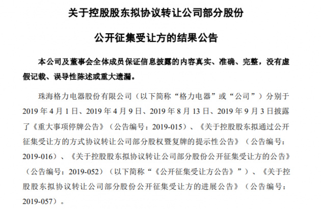 珠海格力電器股份有限公司(以下簡稱“格力電器”或“公司”)分別於 2019 年 4 月 1 日、2019 年 4 月 9 日、2019 年 8 月 13 日、2019 年 9 月 3 日披露了《重大事項停牌公告》(公告編號:2019-015)、《關於控股股東擬通過公開徵集受讓方的方式協議轉讓公司部分股權暨復牌的提示性公告》(公告編號: 2019-016)、《關於控股股東擬協議轉讓公司部分股份公開徵集受讓方的公告》(公告編號:2019-052)(以下簡稱“《公開徵集受讓方公告》”)、《關於控股股東擬協議轉讓公司部分股份公開徵集受讓方的進展公告》(公告編號: 2019-057)。