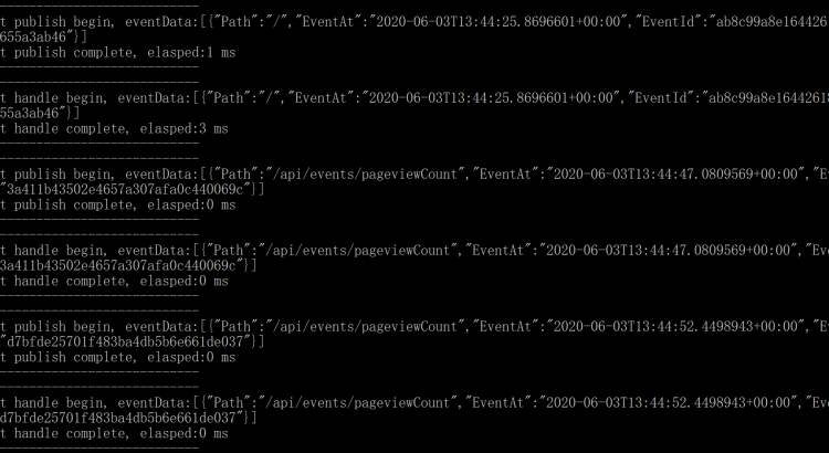 Console.WriteLine($"Event publish complete, elasped:{watch.ElapsedMilliseconds} ms");