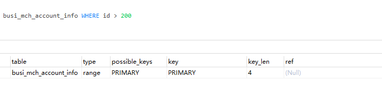 當 type 是 range 時,那麼 EXPLAIN 輸出的 ref 字段為 NULL,並且 key_len 字段是此次查詢中使用到的索引的最長的那個 。