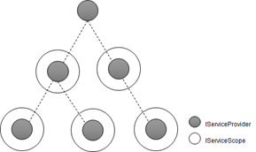 任何一個IServiceProvider對象都可以利用其註冊的IServiceScopeFactory服務創建一個代表服務範圍的IServiceScope對象,後者代表的“範圍”內具有一個新創建的IServiceProvider對象(對應着接口IServiceScope的ServiceProvider屬性),該對象與當前IServiceProvider在邏輯上具有如下圖所示的“父子關係”。