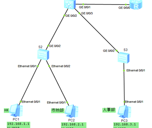 本實驗模擬公司網絡場景。路由器R1是公司的出口網關,員工PC通過接入層交換機(如S2和S3)接入公司網絡,接入層交換機又通過匯聚交換機S1與路由器R1相連。公司內部網絡通過劃分不同的VLAN隔離了不同部門之間的二層通信,保證各部門間的信息安全,但是由於業務需要,經理、市場部和人事部之間需要能實現跨VLAN通信,網絡管理員決定藉助路由器的三層功能,通過配置單臂路由來實現。