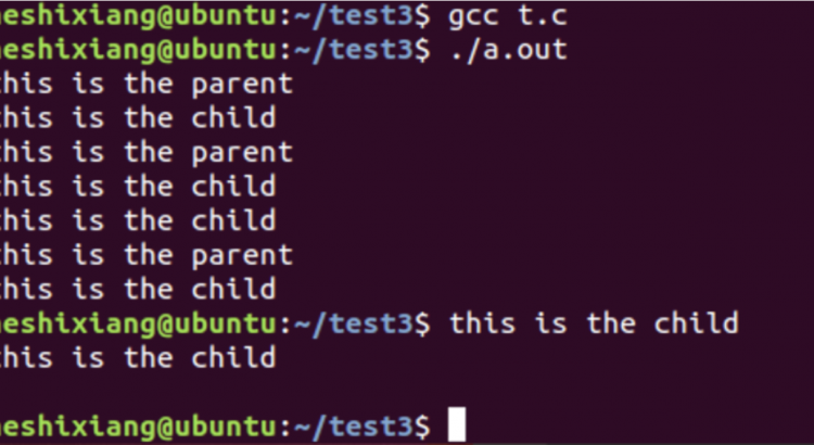 - 這個程序是在Shell下運行的,因此Shell進程是父進程的父進程。父進程運行時Shell進程處於等待狀態,當父進程終止時Shell進程認為命令執行結束了,於是打印Shell提示符,而事實上子進程這時還沒結束,所以子進程的消息打印到了Shell提示符後面。最後光標停在